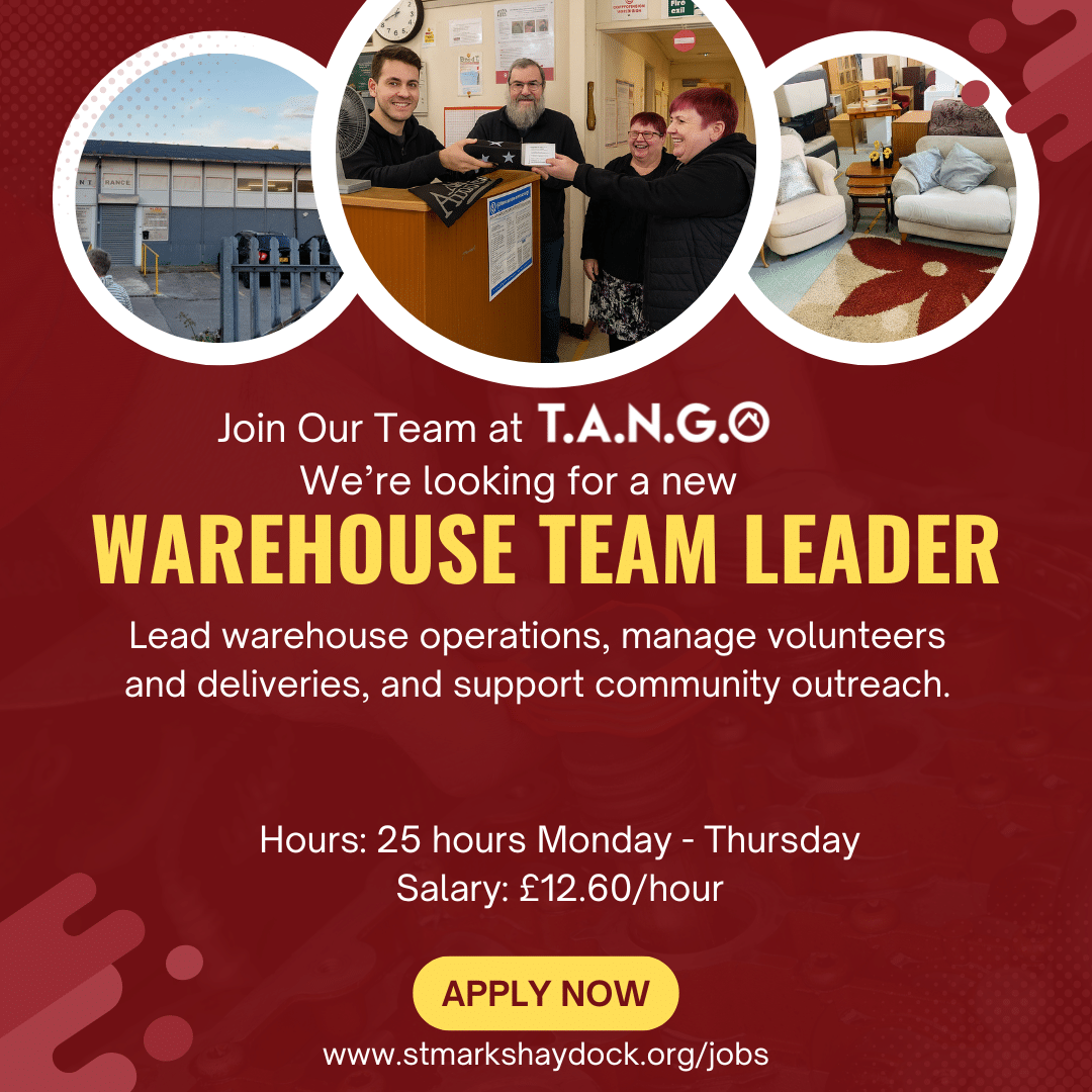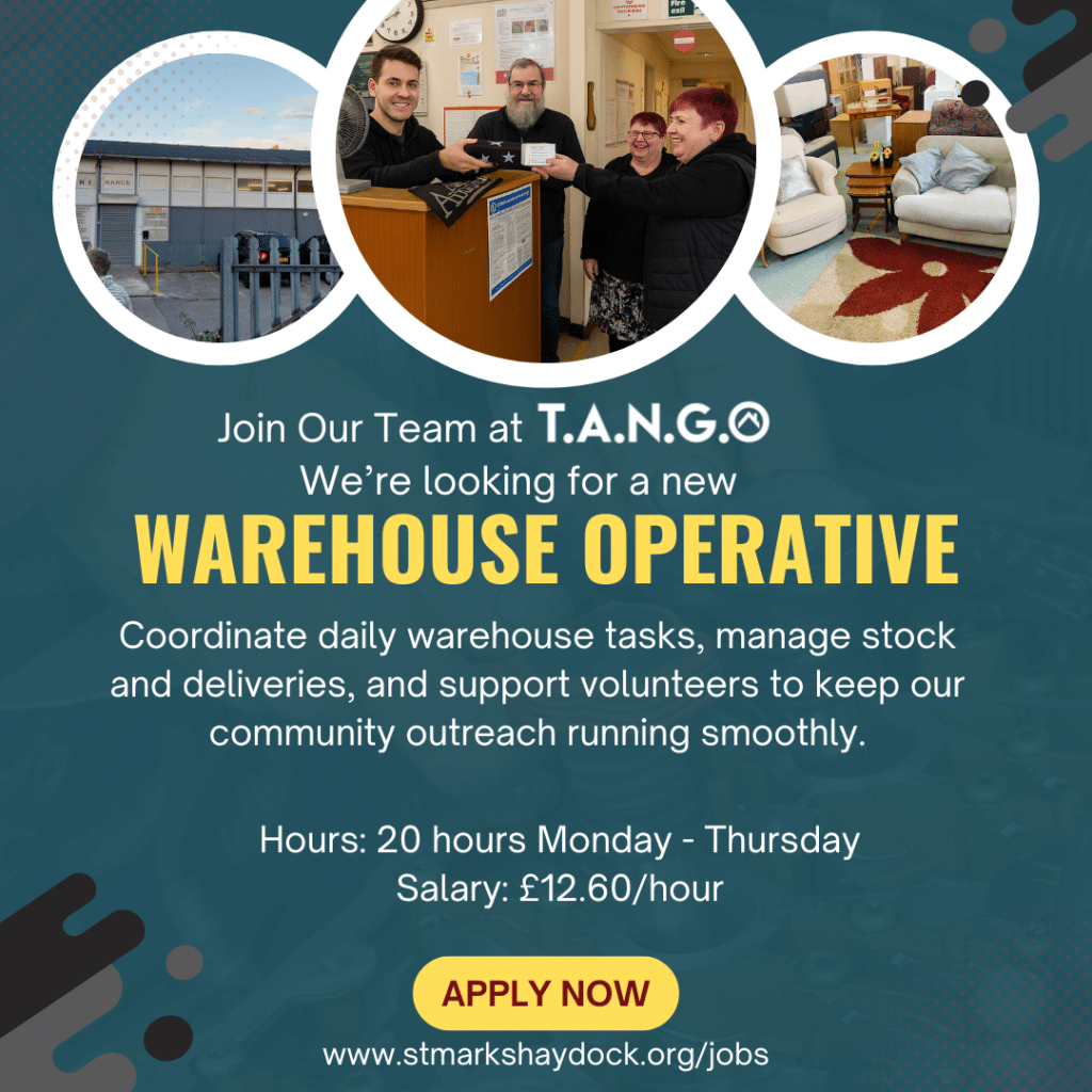 Join the T.A.N.G.O. Community Project as a Warehouse Operative, serving the community through this outreach ministry of St Mark’s Church. The role offers an exciting opportunity to make a real difference in Haydock and beyond, supporting those in need and helping to rebuild family and community life. You will act as an ambassador for T.A.N.G.O. and St Mark’s Church, connecting individuals with community services, and assisting in the day-to-day running and delivery of warehouse services.